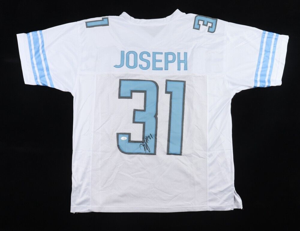 Custom on-field style jersey, everything is sewn on, size XL. Hand-signed by Kerby Joseph.The autograph includes an official James Spence Authentication (JSA) hologram and matching COA for authenticity purposes. The signing of this item was witnessed by JSA.Authentication: JSA COA