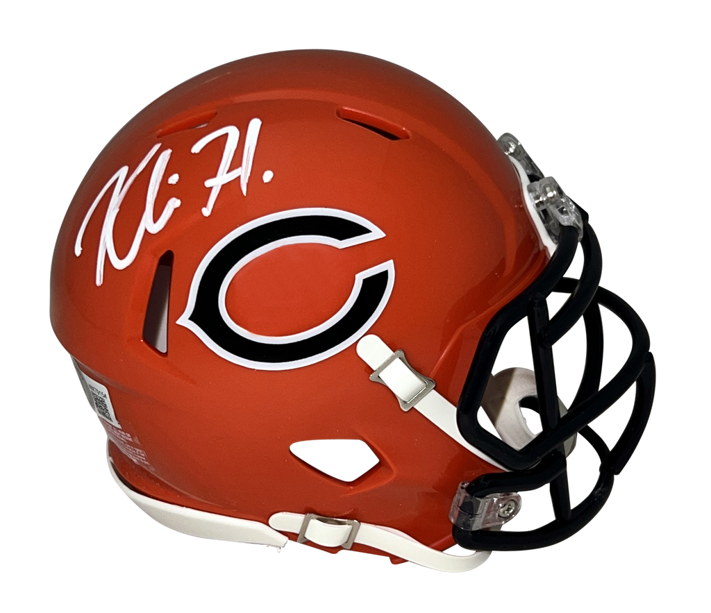 Khalil Herbert, running back for the Chicago Bears, has hand signed this 2022 Alternate Bears Riddell Speed mini helmet at a private signing. This item is authenticated by Beckett Authentication Services and was signed in the presence of one of their representatives. Their tamper-evident hologram featuring a QR code and serial number is on the item. The authenticity can be verified online by entering the serial number or scanning the QR code.Item pictured may not be the exact item you will receive. It will be similar quality, and we guarantee your satisfaction.