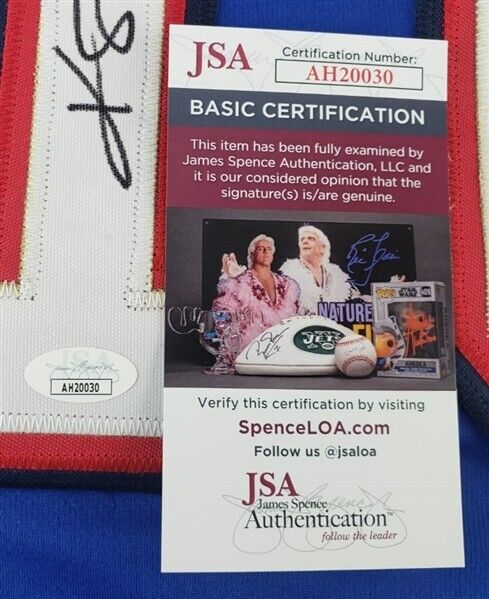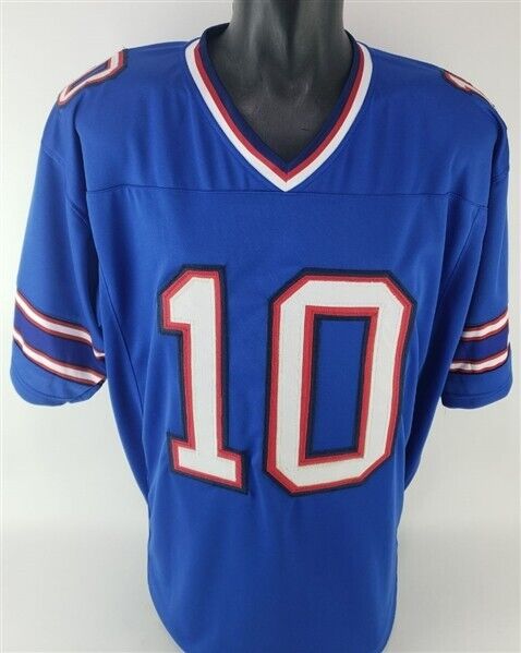 This autographed jersey has been personally hand-signed by Khalil Shakir of the Buffalo Bills. This autograph is certified by James Spence Authentication (JSA). It comes with the numbered hologram and matching Certificate of Authenticity.Custom on-field style jerseys are a more affordable option for autograph seekers. These jerseys do not have any brand name or tags and are made in the Philippines. They feature stitched on names and numbers and are made to look very similar to the on-field jerseys that the players wear. These custom jerseys are very commonly used in the memorabilia industry.
