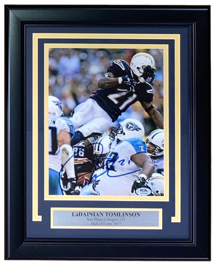 Featured is a LaDainian Tomlinson signed 8x10 San Diego Chargers photo. This photo has been hand signed by Tomlinson and comes with the PSA hologram only. This photo has been professionally framed and matted and is approximately 11x14. This photo would make a great addition to any sports memorabilia collection! SPECIFICATIONS Autographed By: LaDainian Tomlinson Team: San Diego Chargers Sport: Football Authentication: Professional Sports Authenticator (PSA)