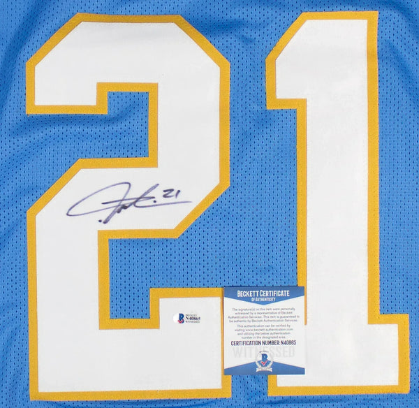 This autographed custom on-field style adult XL jersey has been personally hand-signed by LaDainian Tomlinson of the San Diego Chargers. This autograph is certified by Beckett Authentication Services (BAS) Witness Certification. That means that a Beckett representative was present when this item was signed. It comes with the numbered hologram and matching Certificate of Authenticity.Custom on-field style jerseys are a more affordable option for autograph seekers. These jerseys do not have any brand name or tags and are made in the Philippines. They feature stitched on names and numbers and are made to look very similar to the on-field jerseys that the players wear. These custom jerseys are very commonly used in the memorabilia industry.