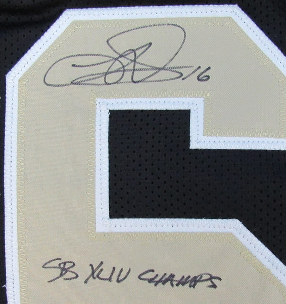 Lance Moore Signed/Inscribed "SB XLIV CHAMPS" Custom Football Jersey New Orleans Saints Size XL. This jersey is authenticated by JSA and includes their Tamper-proof Hologram Sticker.