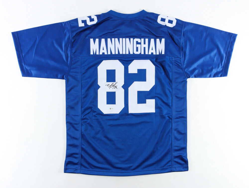 Custom on-field style jersey. Everything is sewn on, size XL. Hand-signed by Mario Manningham.The lot / autograph(s) includes an official Beckett Authentication Services serially-numbered hologram and QR Code card for authenticity purposes. The signing of this item was witnessed by Beckett.Authentication: Beckett Hologram with QR Code card