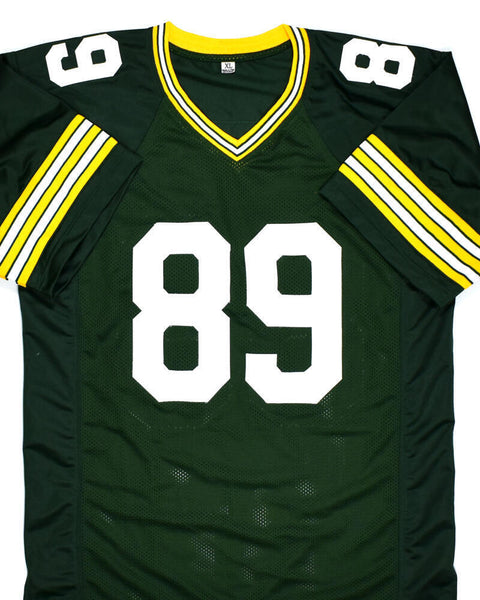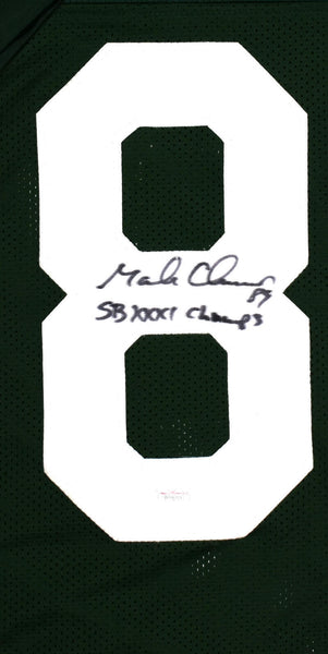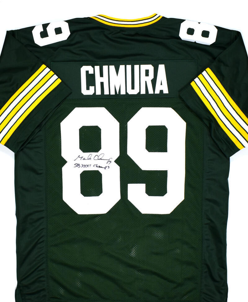 Mark Chmura Autographed Green Pro Style Jersey w/SB Champs - JSA W *Black THIS IS NOT AN NFL JERSEY. THIS HAS NO TAGS, NO LOGOS, NO EMBLEMS. This is a Hand Autograph of Mark Chmura on a custom made (Non Name Brand) authentic style jersey with stitched letters and numbers. Inscribed SB Champs. This item has a James Spence Witness Authentication, which comes with a JSA #'ed Sticker and a Matching JSA Certificate of Authenticity. You can view this item on the SpenceLOA website, it shows when and where the item was signed. It was signed either at a public autograph appearance or a private signing. This is a stock photo of the item. Although you may not receive this exact item, the item you receive is virtually identical and brand new in great shape. Jersey size is XL.