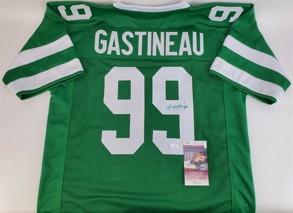 This autographed custom on-field style adult XL jersey has been personally hand-signed by Mark Gastineau of the New York Jets. This autograph is certified by James Spence Authentication's (JSA) Witnessed Protection Program. That means that a JSA representative was present when this item was signed. It comes with the numbered hologram and matching Certificate of Authenticity.Custom on-field style jerseys are a more affordable option for autograph seekers. These jerseys do not have any brand name or tags and are made in the Philippines. They feature stitched on names and numbers and are made to look very similar to the on-field jerseys that the players wear. These custom jerseys are very commonly used in the memorabilia industry.