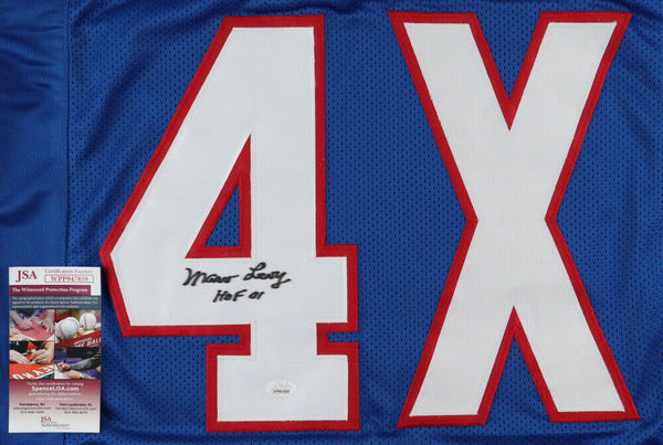 Custom on-field style jersey. Everything is sewn on, size XL. Hand-signed and inscribed by Marv Levy (Former Buffalo Bills 4 Time Super Bowl Head Coach, HOF). The lot / autograph(s) includes an official James Spence Authentication (JSA) hologram and matching COA for authenticity purposes. The signing of this item was witnessed by JSA.Authentication: JSA COA