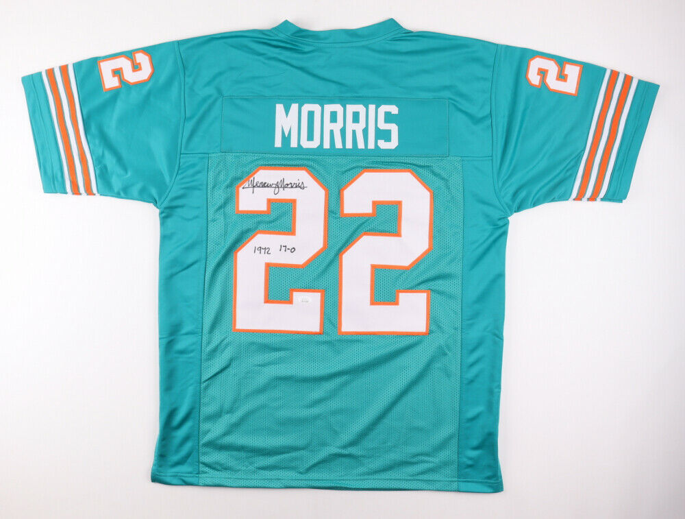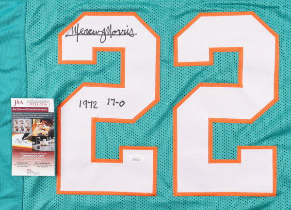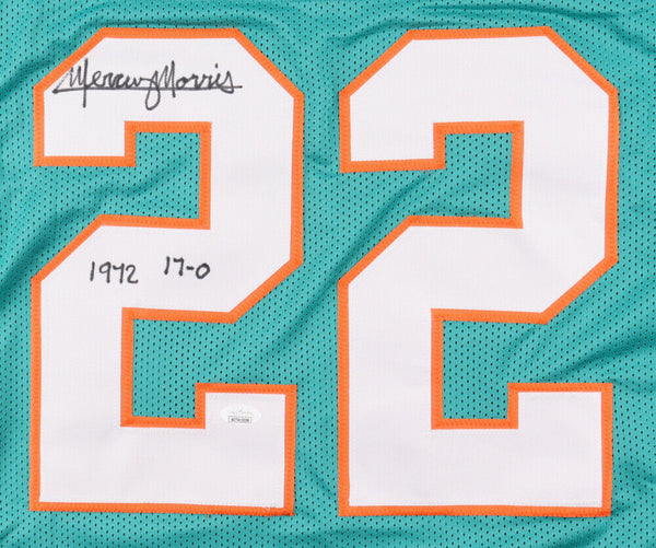 Custom on-field style jersey. Everything is sewn on, size XL. Jersey is hand-signed and inscribed in black felt tip pen by Mercury Morris. The lot / autograph(s) includes an official James Spence Hologram and matching COA for authenticity purposes.Authentication: JSA Witnessed COA