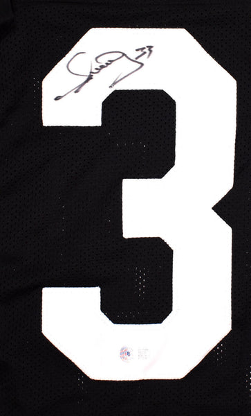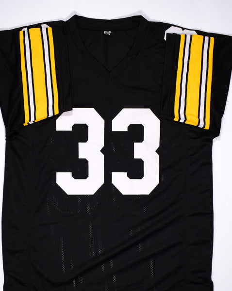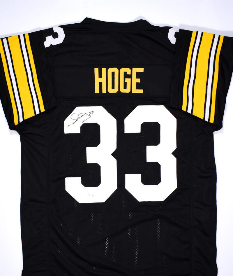 Merrill Hoge Autographed Black Pro Style Jersey- Beckett Hologram *Black THIS IS NOT AN NFL JERSEY. THIS HAS NO TAGS, NO LOGOS, NO EMBLEMS. This is a Hand Autographed Jersey of Merrill Hoge. This is a Custom Made (Non Name Brand) Authentic Style (Stitched Letters and Numbers). This item has a Beckett Authentication, which Comes with a Beckett #'ed hologram and a QR code for verification. You can view this item on the SpenceLOA website. It was signed either at a public autograph appearance or a Private Signing. This is a stock photo of the item. Although you may not receive this exact item, the item you receive is virtually identical and brand new in great shape. Jersey size is XL.