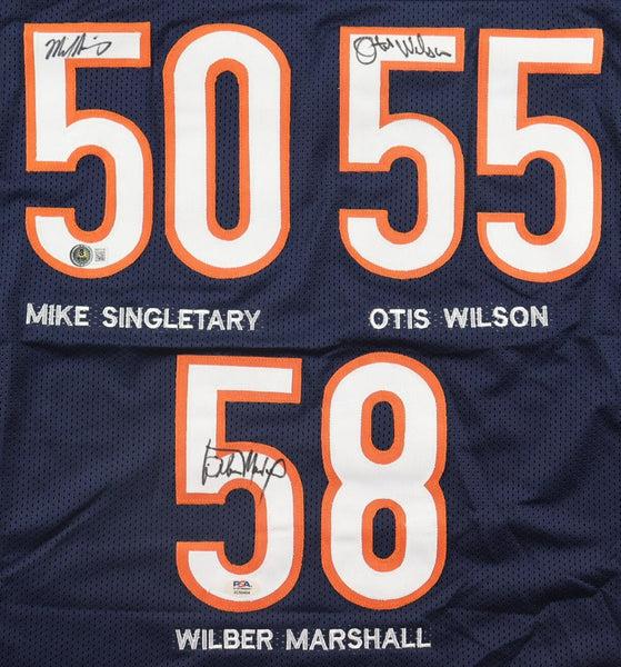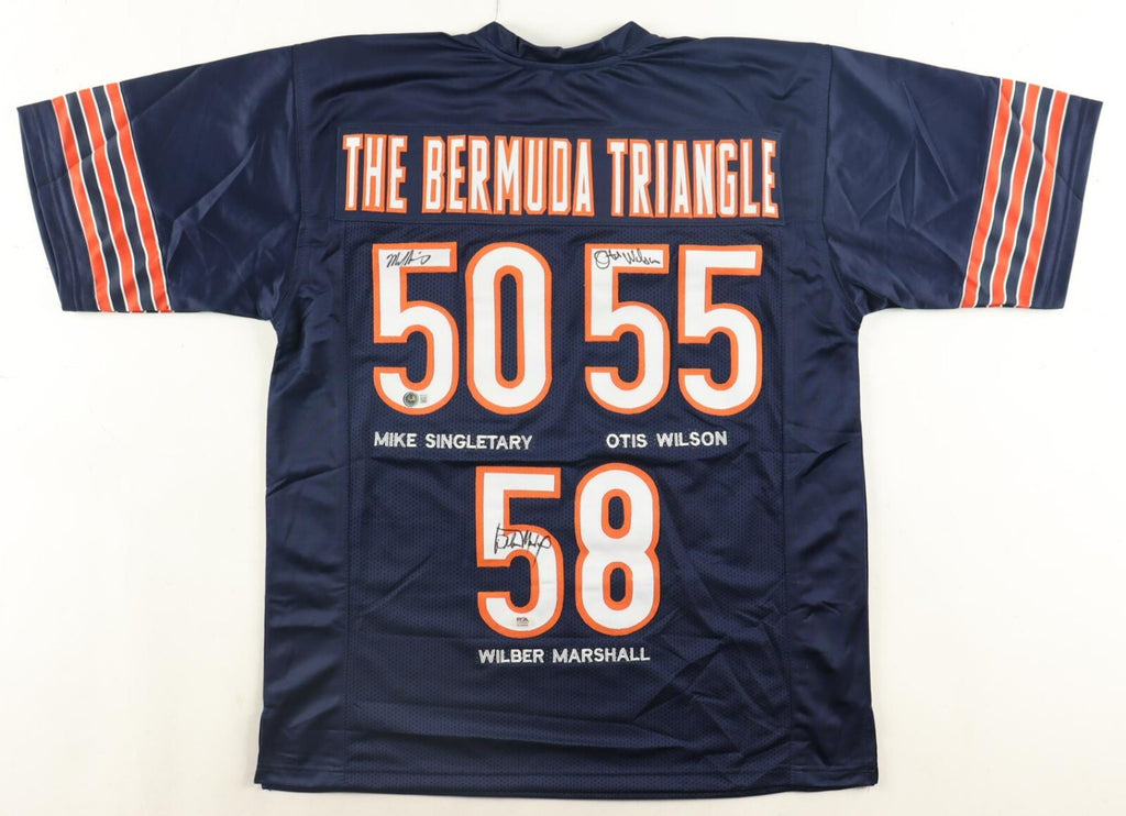 Custom on-field style jersey. Everything is sewn on, size XL. Hand-signed by Mike Singletary (HOF), Otis Wilson, & Wilber Marshall. ("The Bermuda Triangle") The 3 Chicago Bears Starting Linebackers / Super Bowl XX. The autograph includes an official Beckett Authentication Services serially numbered hologram and QR Code card for authenticity purposes. The signing of this item was witnessed by Beckett.Authentication: Beckett Hologram and QR Code cardThe autograph includes an official PSA/DNA hologram and QR Code card for authenticity purposes. The signing of this item was witnessed by PSA.Authentication: PSA Hologram with QR Code card