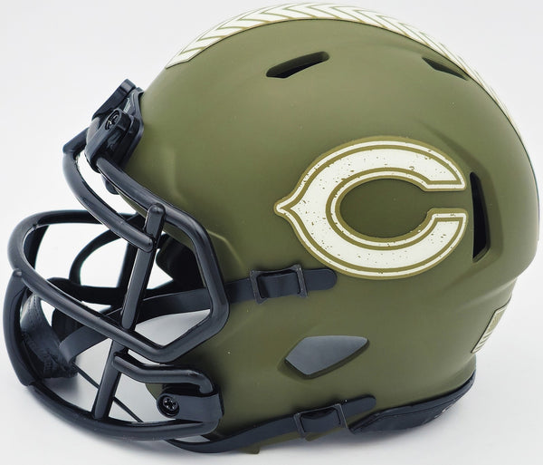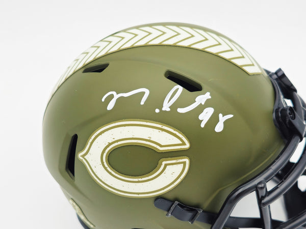 This is a Chicago Bears Army Green Salute to Service Speed Mini Helmet that has been hand signed by Montez Sweat. This item has been certified authentic by JSA and comes with their tamper-proof sticker and matching certificate of authenticity.