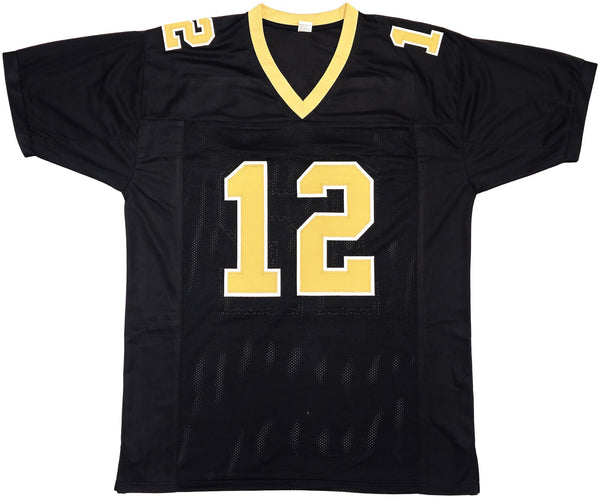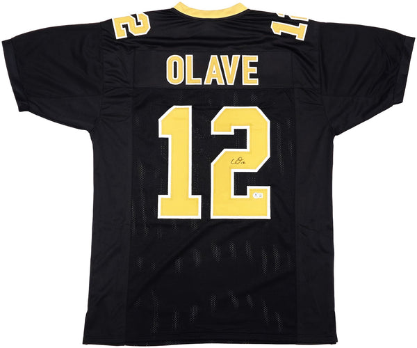 This is a Black Jersey that has been hand signed by Chris Olave. This is a custom jersey with no name brand. The approximate size is XL. It has nice sewn in name and numbers. This item has been witnessed and certified authentic by Beckett Authentication (BAS) and comes with their tamper-proof witness sticker.
