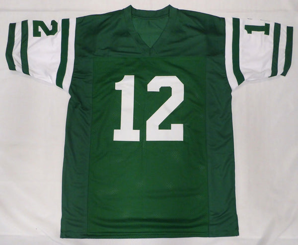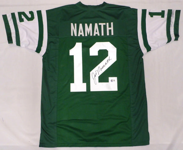This is a Green Jersey that has been hand signed by Joe Namath. This is a custom jersey with no name brand. The approximate size is XL. It has nice sewn in name and numbers. There is an imperfection in the signature as shown. This item has been certified authentic by Beckett Authentication (BAS) and comes with their tamper-proof QR Code sticker that can be verified on the Beckett-authentication.com.