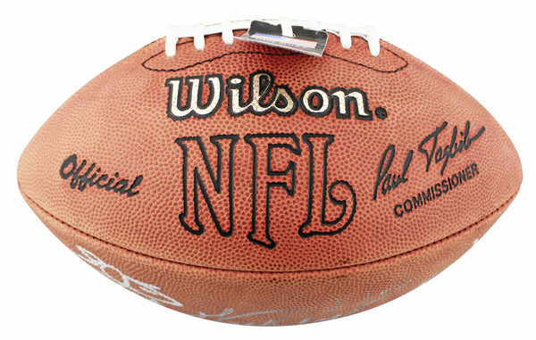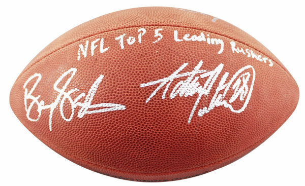 This Autographed Wilson Official Nfl Football with the inscription of "NFL Top 5 Leading Rushers (Peterson)" has been Personally Signed by Walter Payton, Emmitt Smith, Barry Sanders, Frank Gore & Adrian Peterson. This item is 100% Authentic to include a Certificate of Authenticity (COA) / hologram by Beckett Authentication Services. The authenticity can be verified on Beckett Authentication Services website.