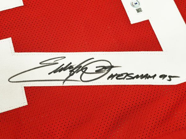 This is a Red Jersey that has been hand signed by Eddie George. This jersey is specially made without any recognizable brand. It is approximately sized as XL and features well-stitched name and numbers. This item was inscribed "Heisman 1995." This item has been witnessed and certified authentic by Beckett Authentication (BAS) and comes with their tamper-proof witness sticker. Beckett Authentication has recently changed their physical certificate card policy where they no longer match their tamper-proof sticker with a physical certificate. A certificate can be printed on Beckett's website for the matching authentication number.