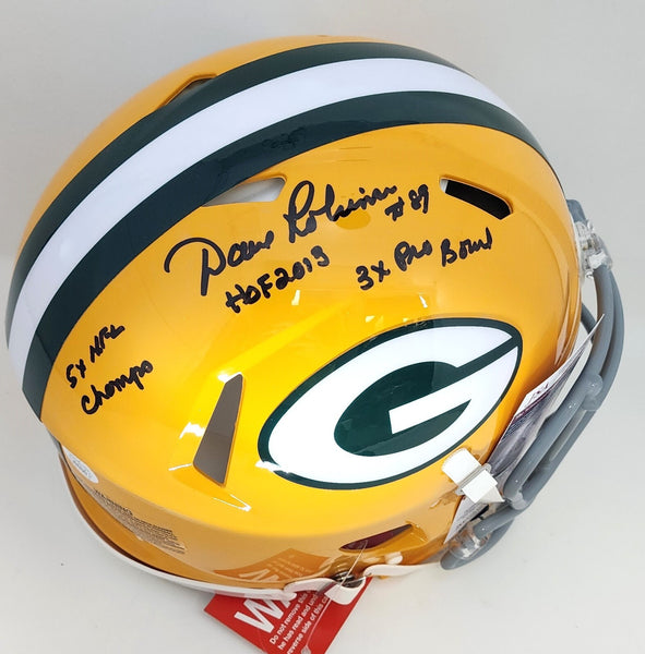 Riddell AUTHENTIC Throwback Speed Helmet hand signed by Green Bay Packers Hall of Famer DAVE ROBINSON. The signature is in Black sharpie and contains the Inscriptions HOF 2013, 5 x NFL Champs and 3 x Pro Bowl. ROBINSON was a member of the PACKERS Super Bowl I & II Championships Teams!. This Helmet was signed at a public signing with us and would make a great addition to any PACKERS collection! This item is guaranteed to be 100% authentic and will include a COA from Waukesha Sportscards with our matching tamper proof hologram.