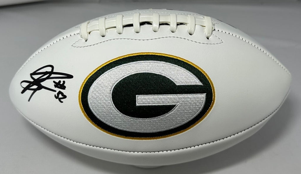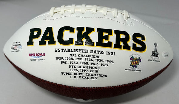 Wilson full size White Panel Packers Logo Football hand signed by Green Bay Packers Linebacker RASHAN GARY. The signature is in Black paint pen. This item was signed at a private signing with us and would make a great addition to any Packers collection. This item comes with JSA authentication.