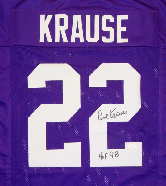 Paul Krause Autographed Purple Pro Style Jersey w/ HOF- JSA Witnessed Auth *R2 THIS IS NOT AN NFL JERSEY. THIS HAS NO TAGS, NO LOGOS, NO EMBLEMS. This is a Hand Autograph of Paul Krause on a custom made (Non Name Brand) authentic style jersey with stitched letters and numbers and inscribed with HOF 98. This item has a James Spence Witness Protection Authentication, which comes with a JSA #'ed Sticker and a matching JSA certificate of authenticity. You can view this item on the SpenceLOA website, it shows when and where the item was signed. It was signed either at a public autograph appearance or a Private Signing. This is a stock photo of the item. Although you may not receive this exact item, the item you receive is virtually identical and brand new in great shape. Jersey size is XL.