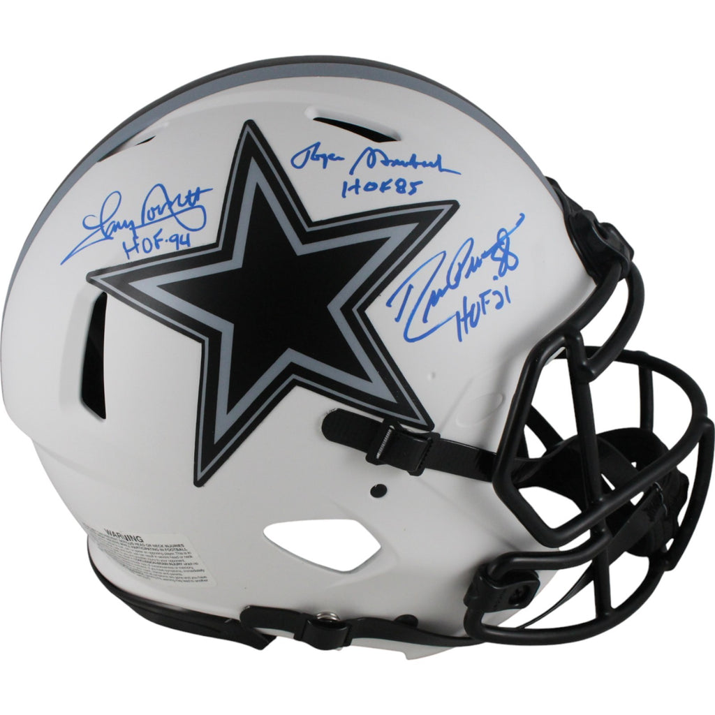 The number in the listing title is just an inventory sku for our records and is not the authentication number. The item pictured is a stock photo unless otherwise noted. This is a Dallas Cowboys Authentic Lunar Full Size Helmet that was personally autographed by Drew Pearson, Roger Staubach, and Tony Dorsett. Includes a certificate of authenticity from Beckett Authentication Services (BAS) and Denver Autographs.FREE SHIPPING within the USA on orders over $10!