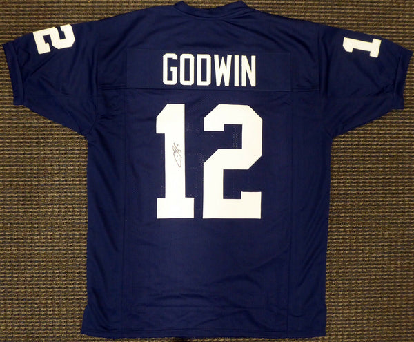 This is a Blue Custom Jersey that has been hand signed by Chris Godwin. This is a custom jersey with no name brand. The approximate size is XL. It has nice sewn in name and numbers. This item has been certified authentic by Beckett Authentication (BAS) and comes with their sticker and matching certificate of authenticity.