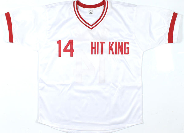 THIS IS NOT AN MLB JERSEY. THIS HAS NO TAGS, NO LOGOS, NO EMBLEMS. This is a hand autograph of Pete Rose of the Cincinnati Reds on a Custom Made (non-name brand) Authentic Style Jersey with stitched letters and numbers. This item has a James Spence Witnessed Authentication, which comes with a JSA numbered hologram and a matching JSA COA for verification. You can view this item on the JSA Authentication website. It was signed either at a public autograph appearance or a private signing. This is a stock photo of the item. Although you may not receive this exact item, the item you receive is virtually identical and brand new in great shape. Jersey size is XL. THIS IS NOT AN MLB JERSEY. THIS HAS NO TAGS, NO LOGOS, NO EMBLEMS. This is a hand autograph of Pete Rose of the Cincinnati Reds on a Custom Made (non-name brand) Authentic Style Jersey with stitched letters and numbers. This item has a James Spence Witnessed Authentication, which comes with a JSA numbered hologram and a matching JSA COA for verification. You can view this item on the JSA Authentication website. It was signed either at a public autograph appearance or a private signing. This is a stock photo of the item. Although you may not receive this exact item, the item you receive is virtually identical and brand new in great shape. Jersey size is XL.
