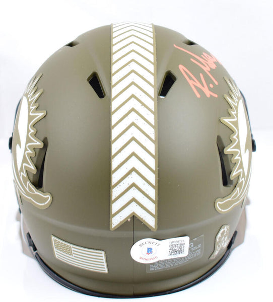 Raheem Mostert Autographed Miami Dolphins Salute to Service Speed Mini Helmet-Beckett W Hologram *Orange This is a Raheem Mostert of the Miami Dolphins hand autographed Riddell Salute to Service Speed mini helmet. This item has a Beckett Witnessed Authentication, which comes with a Beckett numbered hologram and a QR code for verification. You can view this item on the Beckett website and it shows when and where the item was signed. It was signed either at a public autograph appearance or a Private Signing. This is a stock photo of the item. Although you may not receive this exact item, the item you receive is virtually identical, brand new, and in great shape.