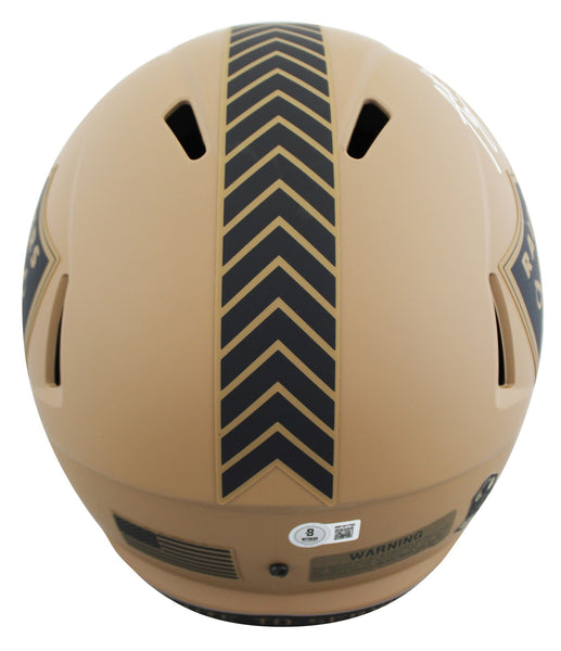 This Autographed Alternate 2023 Salute To Service II Riddell Full Size Speed Rep Helmet W/ Uv Mirrored Back Acrylic Display Case has been Personally Signed by Ashton Jeanty of the Las Vegas Raiders. This item is 100% Authentic to include a hologram by Beckett Authentication Services. This item will come with an affixed Beckett Authentication Services (BAS) authentication sticker, which includes a scannable QR code to verify authenticity. Please note that Beckett no longer provides serial-numbered COA cards, and the attached BAS sticker will serve as the complete authentication for this item. This is a BAS Witnessed Protection Program item which means a Beckett Authentication Service representative was present when this item was being signed. We conducted an autograph signing with Ashton Jeanty where multiples of the same item were signed. While the photographs are representative of this item, the size, placement and strength of the signature may vary. Each item is hand signed, therefore, each autograph is unique. This item can be verified through BAS Witnessed.