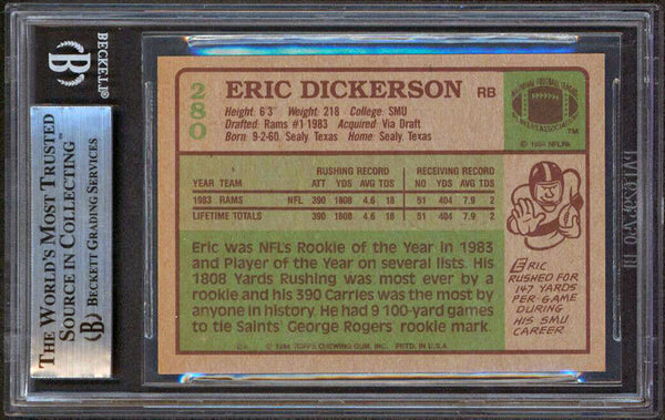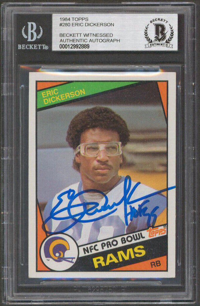 This Autographed 1984 Topps #280 Rookie Card with the inscription of "HOF 99" has been Personally Signed by Eric Dickerson of the Los Angeles Rams. This item is 100% Authentic, it comes slabbed and authenticated by Beckett Authentication Services. This is a stock item. We conducted an autograph signing with Eric Dickerson and we have several of these available. The one you will receive will be of equal quality to the one pictured. This item can be verified through BAS Slabbed.