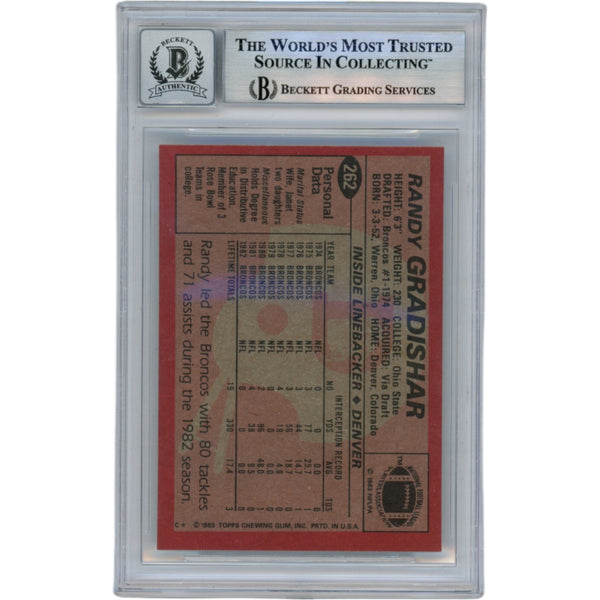 The number in the listing title is just an inventory sku for our records and is not the authentication number. The item pictured is the exact item you will receive, please see photos for condition. This is a Denver Broncos 1983 Topps #262 Slabbed Trading Card with a grade 10 autograph that was personally autographed by Randy Gradishar. Includes a certificate of authenticity from Beckett Authentication Services (BAS) and Denver Autographs.FREE SHIPPING within the USA on orders over $10!