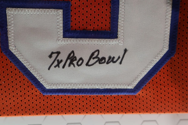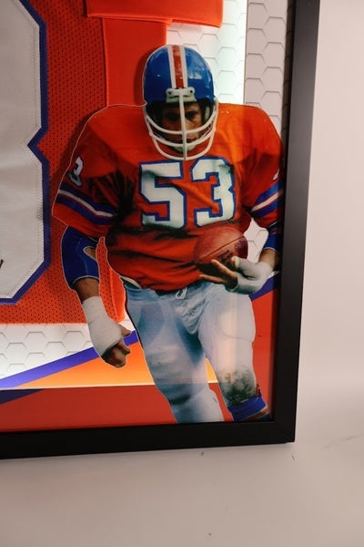 This is a Randy Gradishar autographed Denver Broncos orange custom jersey, professionally framed in a custom LED lighted shadow box. The jersey features four bold inscriptions alongside Gradishar's signature, making this a true collector's gem. Inscriptions include: "HOF '24" "DPOY '78" "7x Pro Bowl" "Orange Crush" Framing features: Framing size: 33.5" x 33.5" LED lighting fully functional, highlighting jersey and design Includes vintage Broncos "D" logo, Gradishar action photo, and 3D nameplate cutout This piece honors a newly inducted Hall of Famer and cornerstone of the Broncos' famed "Orange Crush" defense. A top-tier display item for any serious Broncos fan or collector. Authentication: Beckett COA Condition: Excellent; jersey and frame in mint shape, lights work perfectly