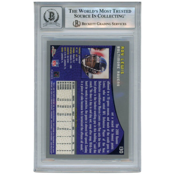 The number in the listing title is just an inventory sku for our records and is not the authentication number. The item pictured is the exact item you will receive, please see photos for condition. This is a Baltimore Ravens 2001 Topps Chrome #130 Slabbed Trading Card that was personally autographed by Ray Lewis. Includes a certificate of authenticity / hologram from Beckett Authentication Services (BAS) and Denver Autographs. FREE SHIPPING within the USA on orders over $10!