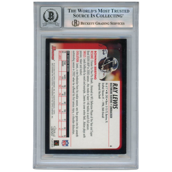 The number in the listing title is just an inventory sku for our records and is not the authentication number. The item pictured is the exact item you will receive, please see photos for condition. This is a Baltimore Ravens 2003 Bowman #6 Slabbed Trading Card that was personally autographed by Ray Lewis. Includes a certificate of authenticity / hologram from Beckett Authentication Services (BAS) and Denver Autographs. FREE SHIPPING within the USA on orders over $10!