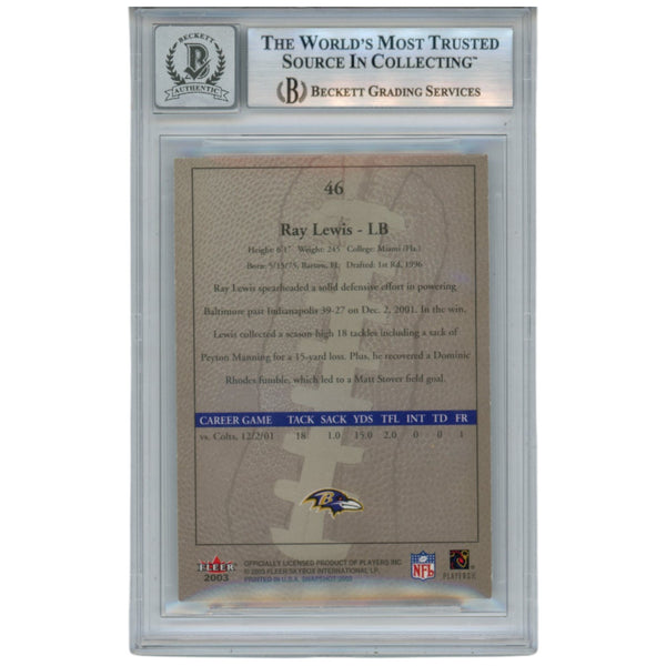 The number in the listing title is just an inventory sku for our records and is not the authentication number. The item pictured is the exact item you will receive, please see photos for condition. This is a Baltimore Ravens 2003 Fleer #46 Slabbed Trading Card that was personally autographed by Ray Lewis. Includes a certificate of authenticity / hologram from Beckett Authentication Services (BAS) and Denver Autographs. FREE SHIPPING within the USA on orders over $10!