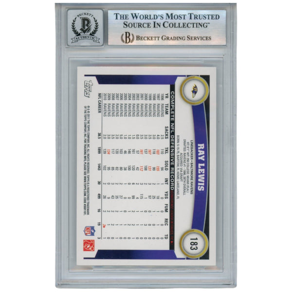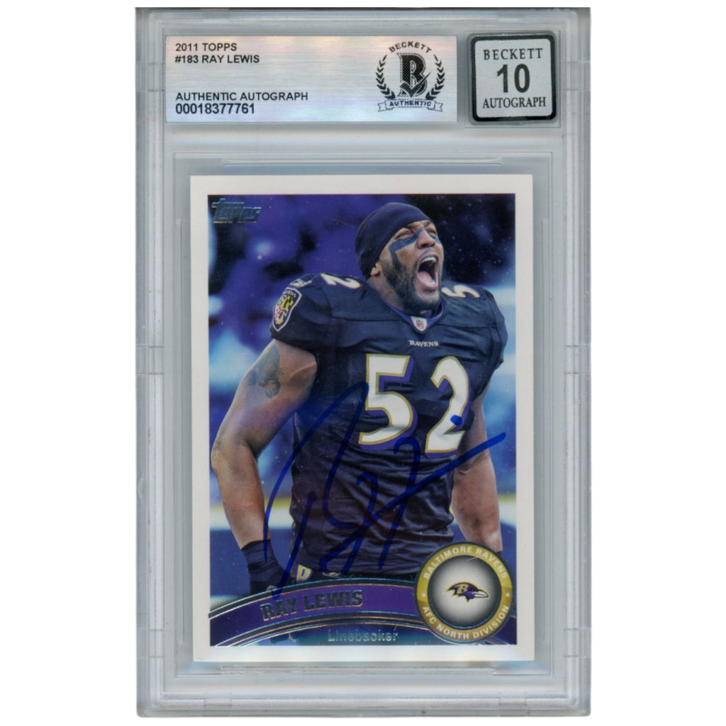 The number in the listing title is just an inventory sku for our records and is not the authentication number. The item pictured is a stock photo. There are multiple quantities of this item. Each of these items is unique because they are individually hand-signed. While the photographs accurately represent the item itself, please note that the signature's size, exact placement, and strength may differ on the one you receive. This is a Baltimore Ravens 2011 Topps #183 Slabbed Trading Card that was personally autographed by Ray Lewis. Includes a certificate of authenticity / hologram from Beckett Authentication Services (BAS) and Denver Autographs. FREE SHIPPING within the USA on orders over $10!