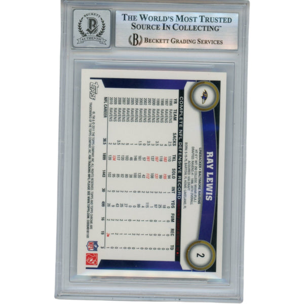 The number in the listing title is just an inventory sku for our records and is not the authentication number. The item pictured is the exact item you will receive, please see photos for condition. This is a Baltimore Ravens 2011 Topps Chrome #2 Slabbed Trading Card that was personally autographed by Ray Lewis. Includes a certificate of authenticity / hologram from Beckett Authentication Services (BAS) and Denver Autographs. FREE SHIPPING within the USA on orders over $10!