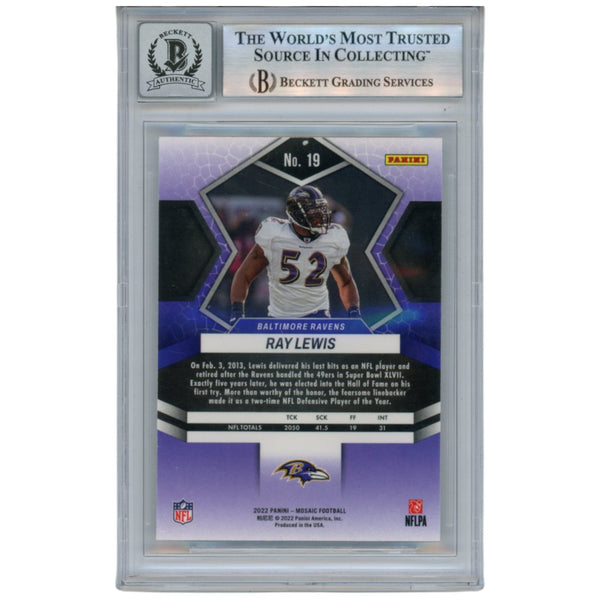 The number in the listing title is just an inventory sku for our records and is not the authentication number. The item pictured is a stock photo. There are multiple quantities of this item. Each of these items is unique because they are individually hand-signed. While the photographs accurately represent the item itself, please note that the signature's size, exact placement, and strength may differ on the one you receive. This is a Baltimore Ravens 2022 Mosiac #19 Slabbed Trading Card that was personally autographed by Ray Lewis. Includes a certificate of authenticity / hologram from Beckett Authentication Services (BAS) and Denver Autographs. FREE SHIPPING within the USA on orders over $10!