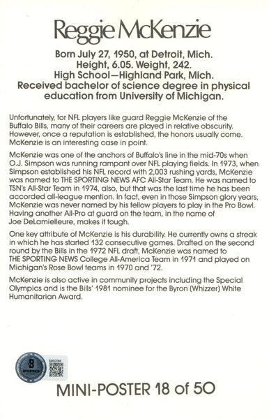 Reggie McKenzie Autographed Buffalo Bills Mini Poster 18/50 Beckett 46127