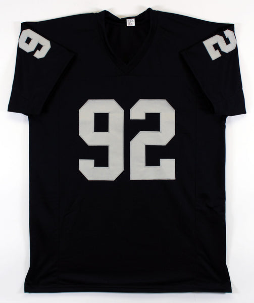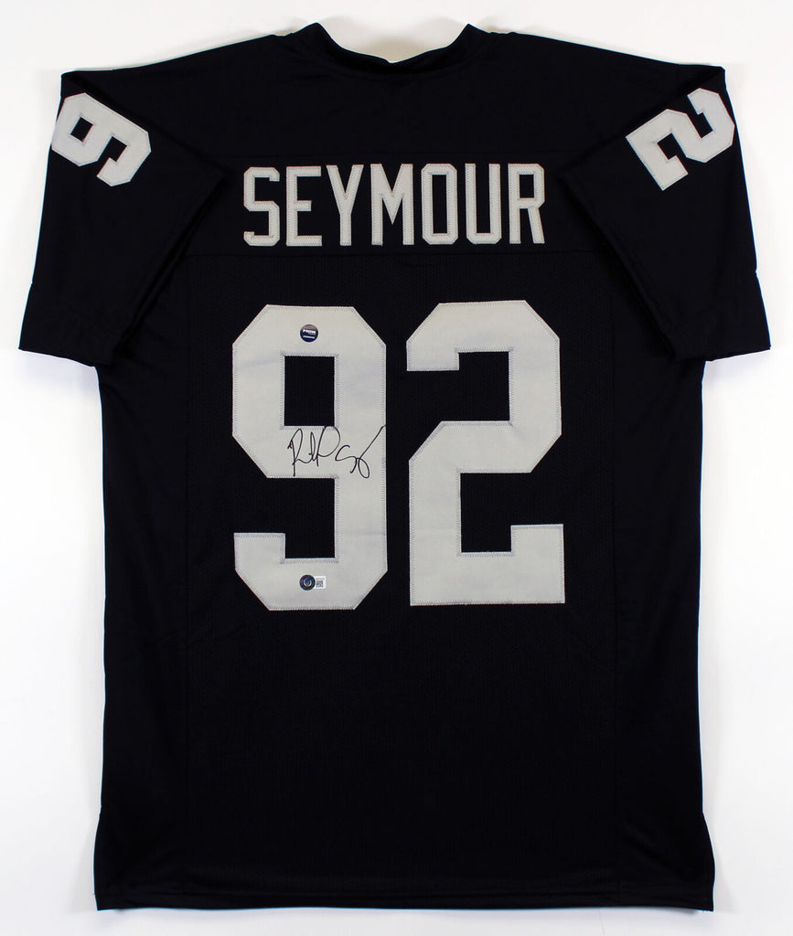 This Autographed Black Pro Style Jersey has been Personally Signed by Richard Seymour of the Oakland Raiders. This item is 100% Authentic to include a hologram by Beckett Authentication Services. This item will come with the new Beckett Authentication hologram that has a scannable QR code rather than the traditional COA. If you would like to have a COA, you are welcome to reach out to Beckett for a printed certification once you receive your item. This is a BAS Witnessed Protection Program item which means a Beckett Authentication Service representative was present when this item was being signed. We conducted an autograph signing with Richard Seymour where multiples of the same item were signed. While the photographs are representative of this item, the size, placement and strength of the signature may vary. Each item is hand signed, therefore, each autograph is unique. This item can be verified through BAS Witnessed. This is a X-Large sized, non-branded, custom-stitched Jersey.