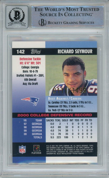 Richard Seymour Signed Patriots 2001 Bowman #142 Beckett Auto 10 40711 The number in the listing title is just an inventory sku for our records and is not the authentication number. This is a 2001 Bowman #142 trading card that was personally autographed by Richard Seymour. This was professionally authenticated and slabbed by Beckett Authentication Services (BAS), also includes a certificate of authenticity from Denver Autographs.