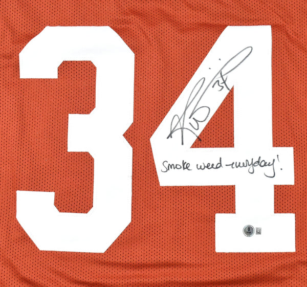 THIS IS NOT AN NCAA JERSEY. THIS HAS NO TAGS, NO LOGOS, NO EMBLEMS. This is a hand autograph of Ricky Williams of University of Texas on a Custom Made (non name brand) Authentic Style Jersey with stitched letters and numbers. Inscribed Smoke Weed Everyday. This item has a Beckett Witnessed Authentication, which comes with a Beckett numbered sticker hologram and a QR Code for verification. You can view this item on the Beckett Authentication website. It was signed either at a public autograph appearance or a private signing. This is a stock photo of the item. Although you may not receive this exact item, the item you receive is virtually identical and brand new in great shape. Jersey size is XL. THIS IS NOT AN NCAA JERSEY. THIS HAS NO TAGS, NO LOGOS, NO EMBLEMS. This is a hand autograph of Ricky Williams of University of Texas on a Custom Made (non name brand) Authentic Style Jersey with stitched letters and numbers. Inscribed Smoke Weed Everyday. This item has a Beckett Witnessed Authentication, which comes with a Beckett numbered sticker hologram and a QR Code for verification. You can view this item on the Beckett Authentication website. It was signed either at a public autograph appearance or a private signing. This is a stock photo of the item. Although you may not receive this exact item, the item you receive is virtually identical and brand new in great shape. Jersey size is XL.