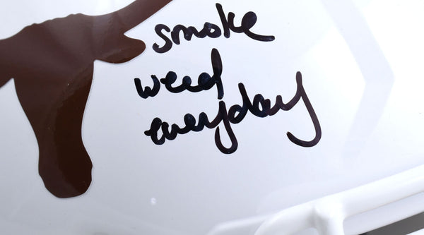 This is a Ricky Williams of the Texas Longhorns Autographed Riddell football full size Speed Replica helmet. Inscribed Smoke Weed Everyday. This item has a Beckett Witnessed Authentication, which comes with a numbered hologram and a QR code for verification. You can view this item on the Beckett Authentication website and it shows when and where the item was signed. It was signed either at a public autograph appearance or a private signing. This is a stock photo of the item. Although you may not receive this exact item, the item you receive is virtually identical, brand new, and in great shape. *Autograph location may vary* This is a Ricky Williams of the Texas Longhorns Autographed Riddell football full size Speed Replica helmet. Inscribed Smoke Weed Everyday. This item has a Beckett Witnessed Authentication, which comes with a numbered hologram and a QR code for verification. You can view this item on the Beckett Authentication website and it shows when and where the item was signed. It was signed either at a public autograph appearance or a private signing. This is a stock photo of the item. Although you may not receive this exact item, the item you receive is virtually identical, brand new, and in great shape. *Autograph location may vary*