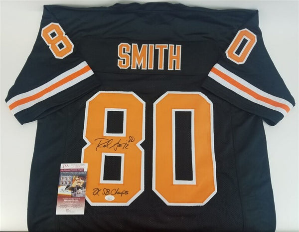 This Custom on-field style adult XL autographed jersey has been personally hand-signed by Rod Smith of the Denver Broncos. Smith added the inscription "2x SB Champs" along with his signature.This autograph is certified by James Spence Authentication's (JSA) Witnessed Protection Program. That means that a JSA representative was present when this item was signed. It comes with the numbered hologram and matching Certificate of Authenticity. Custom on-field style jerseys are a more affordable option for autograph seekers. These jerseys do not have any brand name or tags and are made in the Philippines. They feature stitched on names and numbers and are made to look very similar to the on-field jerseys that the players wear. These custom jerseys are very commonly used in the memorabilia industry.