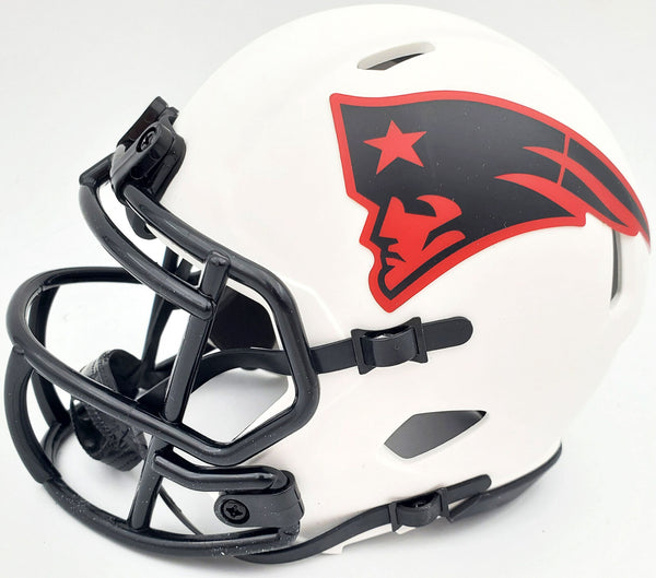 This is a New England Patriots Lunar Eclipse White Speed Mini Helmet that has been hand signed by Rodney Harrison. This item has been certified authentic by Beckett Authentication (BAS) and comes with their tamper-proof QR Code sticker that can be verified on the Beckett-authentication.com.