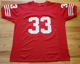This is a hand autographed Roger Craig San Francisco 49ers Red jersey with "3x SB Champs" inscribed by him! This is a custom made replica jersey of high quality, with letters and numbers stitched, it has no team logos, patches, or emblems and is size XL. Roger Craig was the 49th overall selection in the 1983 NFL draft, and in his rookie season he had 12 total TDs and led his team to the NFC Championship game, his high knee running technique made him a standout quickly after joining the league. He was a 4x Pro-Bowler and Three time NFL Champion! This jersey comes with a tamper proof JSA coded sticker and matching paper JSA Witness Certificate of Authenticity (an EBAY approved autograph authenticator per their website). This is the best form of certification out there it guarantees a JSA rep was on hand to witness this signing in person!