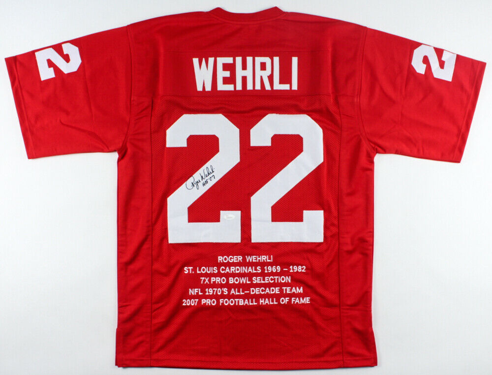 Custom on-field style jersey. Everything sewn on, size XL. Hand-signed and inscribed in black felt-tip pen by Roger Wehrli (HOF). The lot / autograph(s) includes an official James Spence Authentication (JSA) hologram for authenticity purposes. The signing of this item was witnessed by JSA.Authentication: JSA Hologram