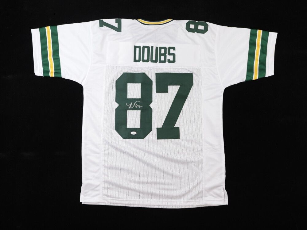 This autographed custom on-field style Adult XL jersey has been personally hand-signed by Romeo Doubs of the Green Bay Packers.This autograph is certified by James Spence Authentication (JSA). It comes with the numbered hologram and matching Certificate of Authenticity.Custom on-field style jerseys are a more affordable option for autograph seekers. These jerseys do not have any brand name or tags and are made in the Philippines. They feature stitched on names and numbers and are made to look very similar to the on-field jerseys that the players wear. These custom jerseys are very commonly used in the memorabilia industry.
