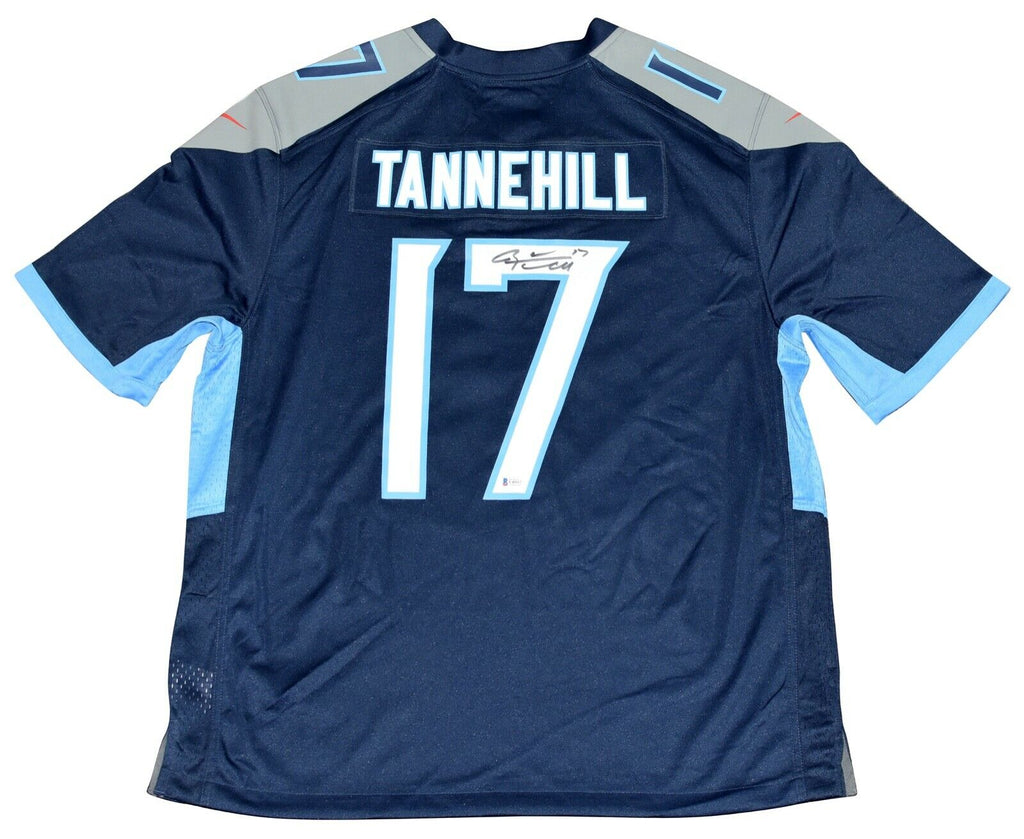 Ryan Tannehill, star quarterback for the Tennessee Titans, has hand signed this navy Nike jersey at a private signing. Jersey is new and all letters/numbers are screen print. This item comes with a certificate of authenticity (COA) from Becket Authentication Services and was signed in the presence of one of their representatives. You will receive a serial-numbered COA along with a matching serial-numbered sticker on the jersey. The authenticity can be verified online by entering the serial number. Item pictured may not be the exact item you will receive. It will be similar quality, and we guarantee your satisfaction.