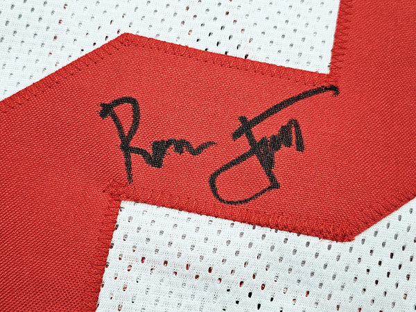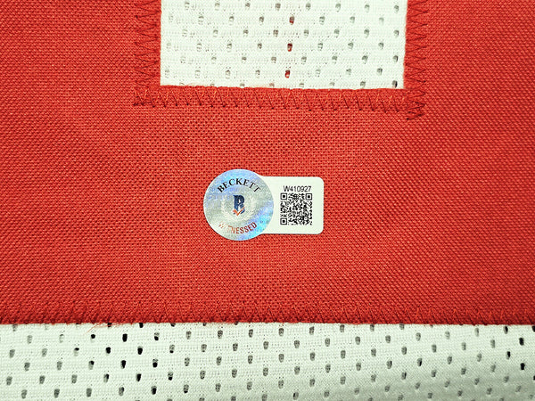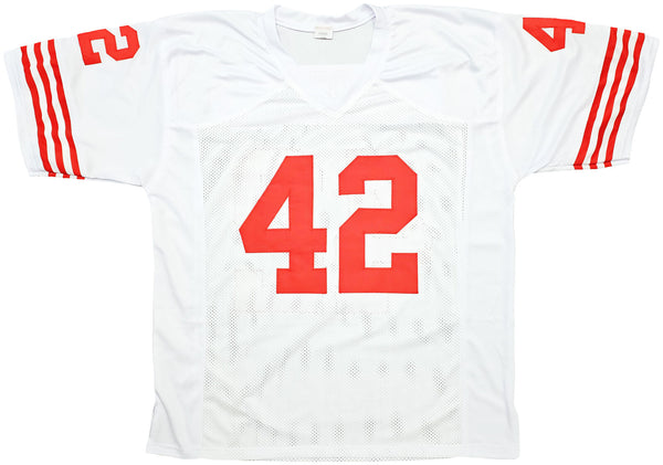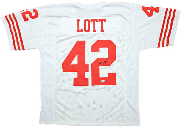 This is a White Jersey that has been hand signed by Ronnie Lott. This is a custom jersey with no name brand. The approximate size is XL. It has nice sewn in name and numbers. This item has been witnessed and certified authentic by Beckett Authentication (BAS) and comes with their tamper-proof witness sticker. Beckett Authentication has recently changed their physical certificate card policy where they no longer match their tamper-proof sticker with a physical certificate. A certificate can be printed on Beckett's website for the matching authentication number.