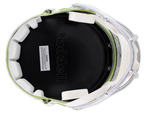 This Autographed Alternate Flash Riddell Full Size Speed Rep Helmet has been Personally Signed by Kenneth Walker III of the Seattle Seahawks. This item is 100% Authentic to include a hologram by Beckett Authentication Services. This item will come with an affixed Beckett Authentication Services (BAS) authentication sticker, which includes a scannable QR code to verify authenticity. Please note that Beckett no longer provides serial-numbered COA cards, and the attached BAS sticker will serve as the complete authentication for this item. This is a BAS Witnessed Protection Program item which means a Beckett Authentication Service representative was present when this item was being signed. We conducted an autograph signing with Kenneth Walker III where multiples of the same item were signed. While the photographs are representative of this item, the size, placement and strength of the signature may vary. Each item is hand signed, therefore, each autograph is unique. This item can be verified through BAS Witnessed.