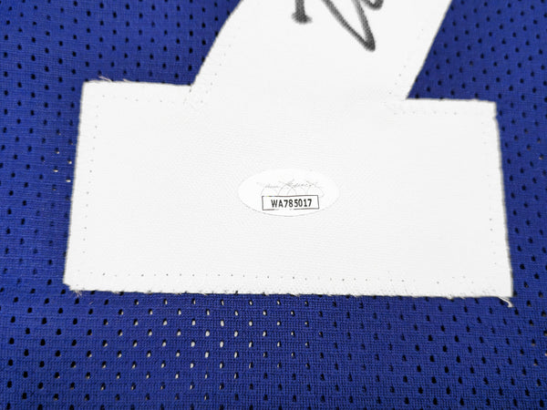 This is a Blue Jersey that has been hand signed by Walter Jones. This is a custom jersey with no name brand. The approximate size is XL. It has nice sewn in name and numbers. This item was inscribed "HOF 14." This item has been certified authentic by JSA and comes with their tamper-proof hologram and matching certificate of authenticity.