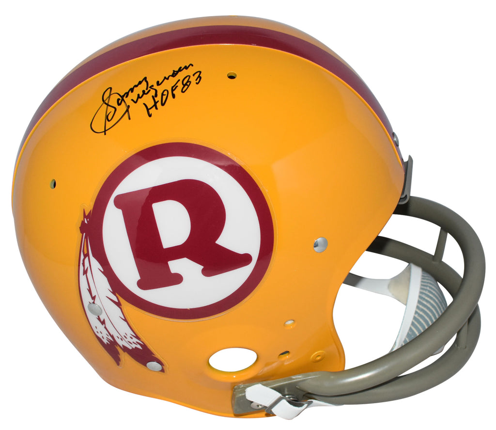 Sonny Jurgensen, former Hall of Fame quarterback for the Washington Redskins, has hand signed this Redskins Riddell full-size throwback helmet at a private signing. He included the inscription "HOF 83". This item comes with a certificate of authenticity (COA) from Beckett Authentication Services and was signed in the presence of one of their representatives. You will receive a serial-numbered COA along with a matching serial-numbered sticker on the helmet. The authenticity can be verified online by entering the serial number.Item pictured may not be the exact item you will receive. It will be similar quality, and we guarantee your satisfaction.
